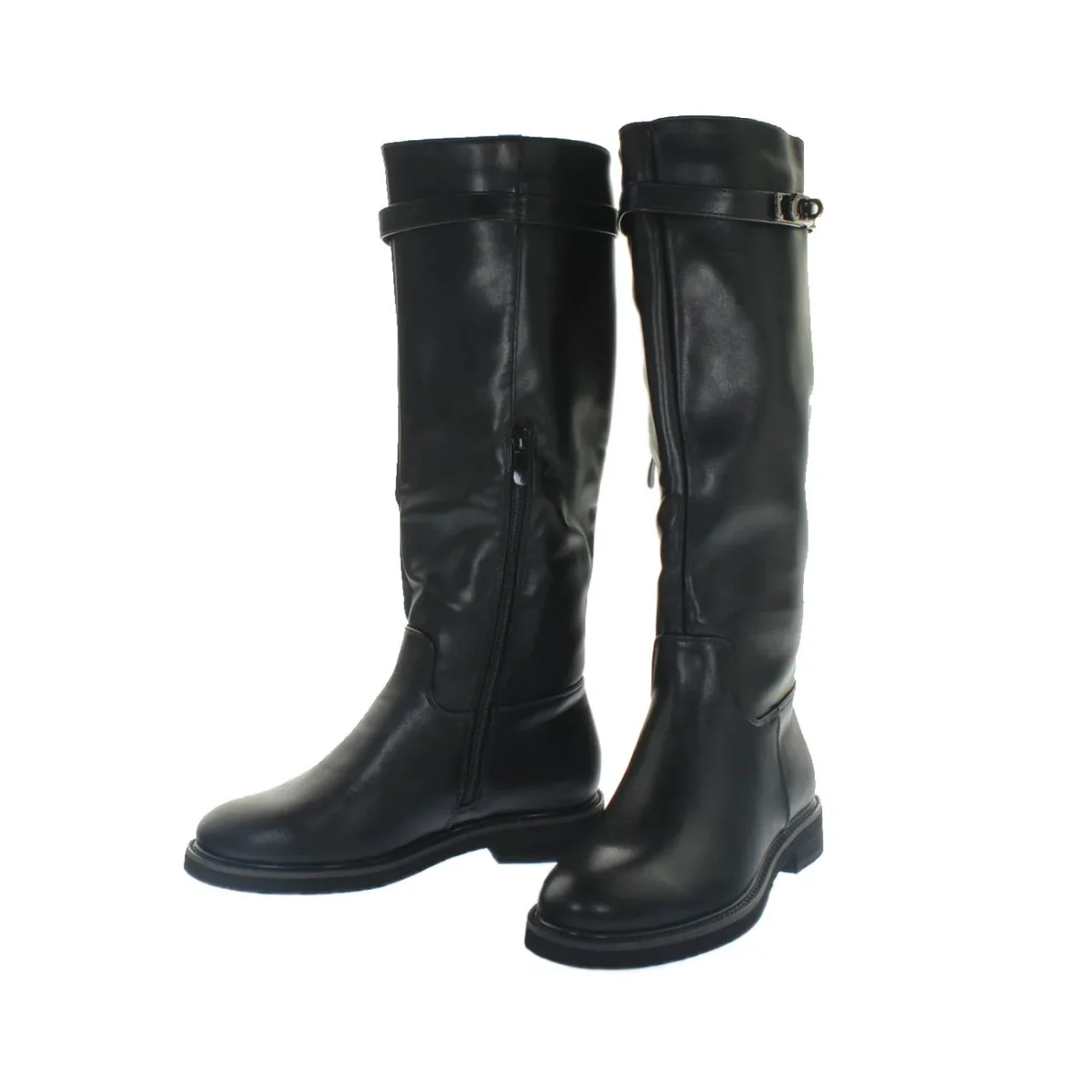 Stivali DONNA – Modello: 8313 – Colore: NERO Eleganti stivali da donna, realizzati in similpelle, con chiusura zip laterale interna. Presentano suola in gomma di 30 mm e un morbido sottopiede imbottito in vera pelle. Caratterizzati da gambale dritto e da fibbia in metallo sono passepartout da tenere nell’armadio, ideale per outfit formali e informali!